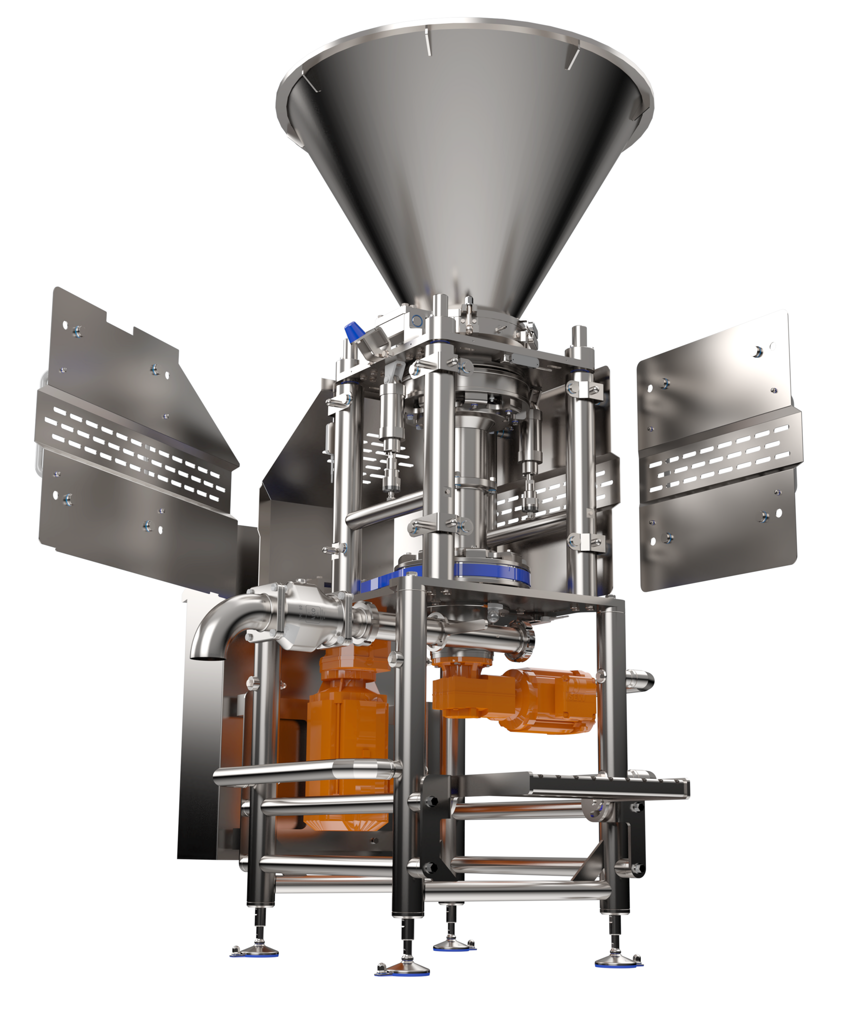 Мотор-редукторы с частотным регулированием позволяют независимо регулировать скорость и направление вращения в зависимости от типа подаваемого материала. Выходная горловина регулируется пневматическим клапаном, который может адаптироваться к различной вязкости. Возможны различные варианты настройки, например, непрерывный, пульсирующий или регулируемый по времени.